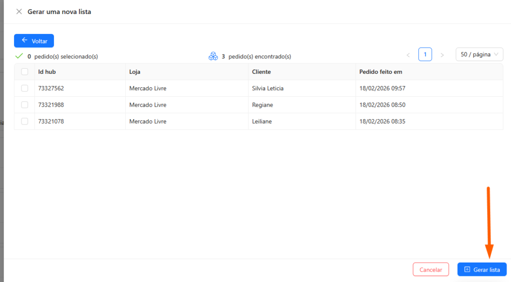 Na lista gerada, selecione os pedidos que você deseja incluir na listagem de separação e impressão, ou se preferir clique em gerar lista sem selecionar nem um pedido, para criar uma lista com todos os pedidos filtrados.