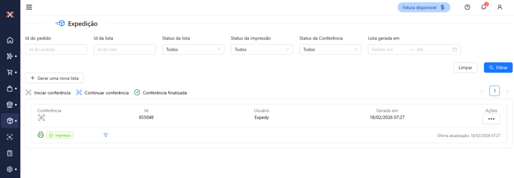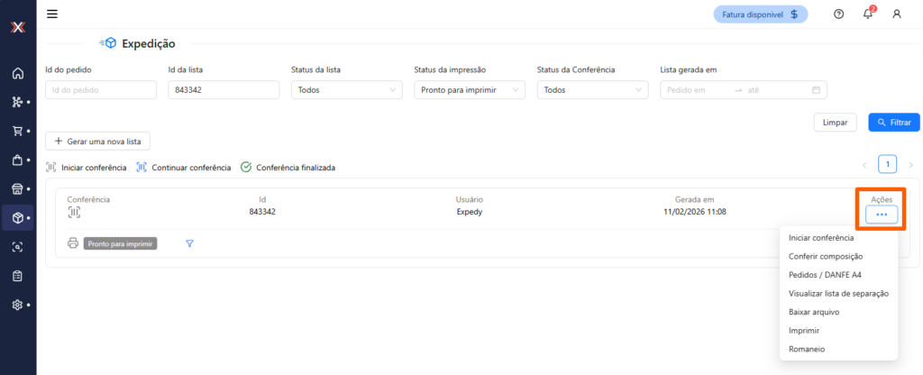- Imprimir: Função utilizada por clientes que possuem integração com o robô de impressão (Apenas clientes que utilizam a expedição por Conferência/bipagem);