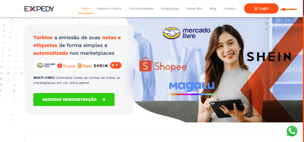 O acesso ao sistema é feito diretamente pelo navegador do site https://expedy.com.br, onde no canto superior direito você terá o botão “Login”.