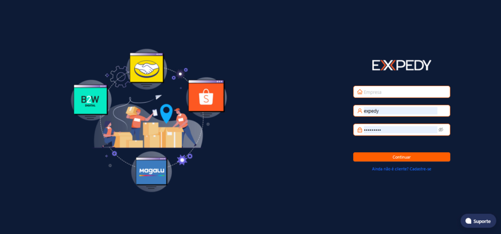 Seu usuário e senha também foram criados por você no momento da contratação. Tendo todas as informações em mãos basta preenche-las para acessar a home da EXPEDY.