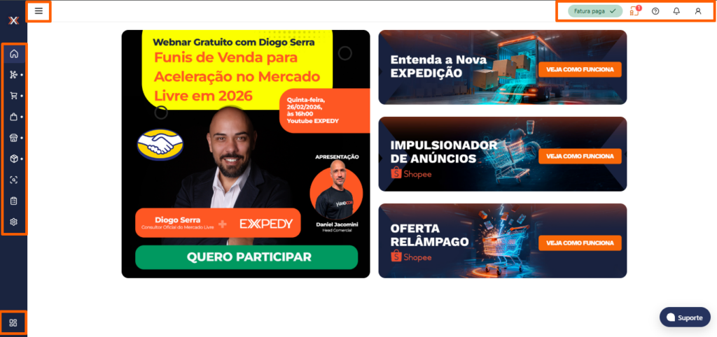 Após acessar a plataforma, observe que há um menu com ícones localizado na lateral esquerda da tela, representando as principais funcionalidades. Esse menu pode ser expandido clicando no botão ao lado do logotipo da plataforma.