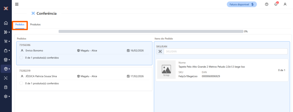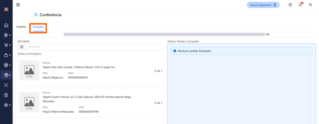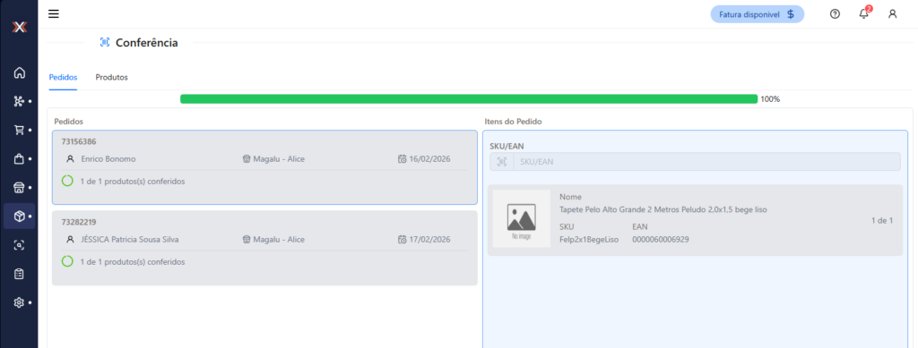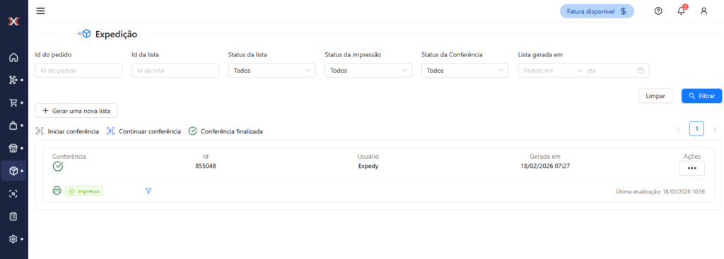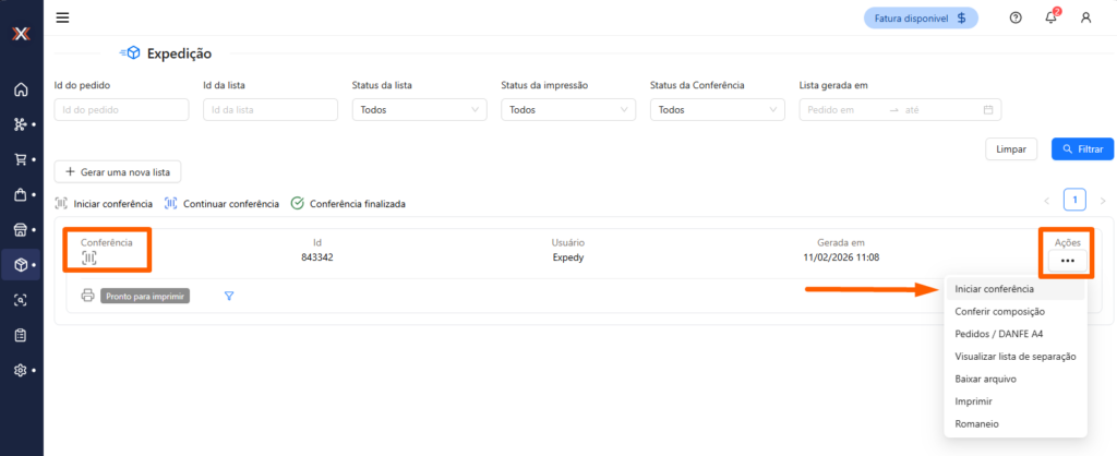 A conferência é a etapa do processo em que é realizada o checkout dos produtos, para verificar se todos os itens dos pedidos foram devidamente separados, embalados e com as etiquetas/impressões corretas, garantindo que não haja divergências antes do envio.