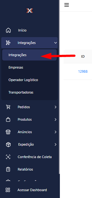 1. Acesse o menu lateral ‘Integrações’ e clique na opção “Integrações”.