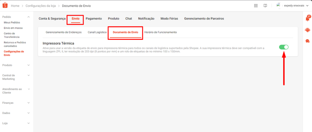 3. Após confirmar que o cadastro e a configuração da integração estão corretos, acesse sua loja na Shopee. No menu lateral esquerdo, localize a opção ‘Configurações de Envio’. Em seguida, acesse a aba ‘Envio’ e, por fim, ative a opção “Impressora Térmica”.