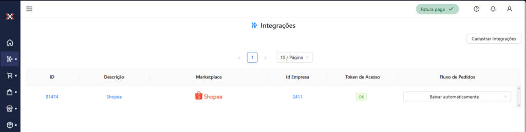 2. Após acessar a tela de ‘Integrações’, verifique se a integração da Shopee já está cadastrada e devidamente configurada dentro da EXPEDY.