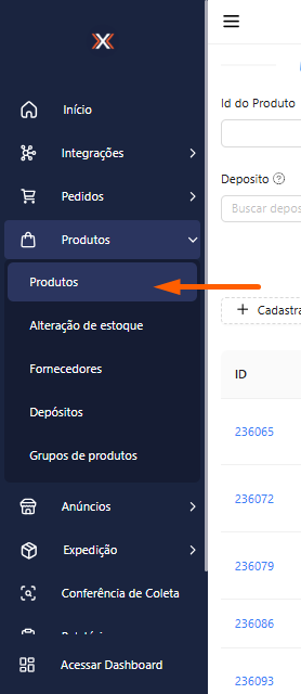 1. Acesse o menu lateral ‘Produtos’ e clique na opção “Produtos”.