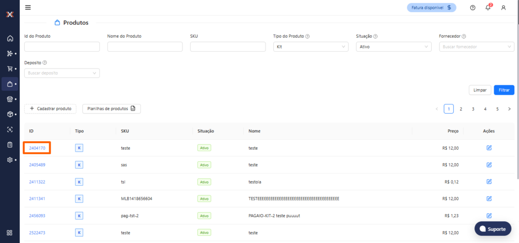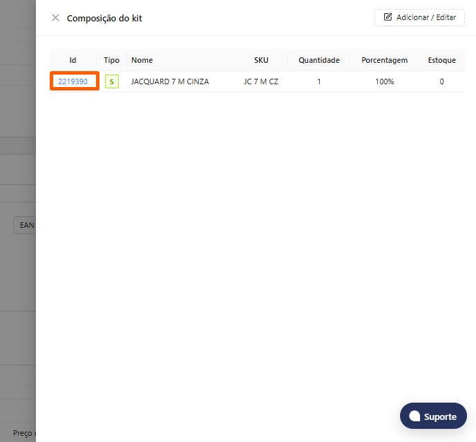 4. A segunda forma de controlar o estoque dos produtos Kits é com estoque próprio (não dinâmico). Com o Kit Dinâmico desativado: O kit funciona como um produto simples, O estoque pode ser alterado diretamente na tela de cadastro do produto. Após acessar a tela de ‘Produtos’, selecione o produto que deseja alterar o estoque clicando no “ID” do produto.