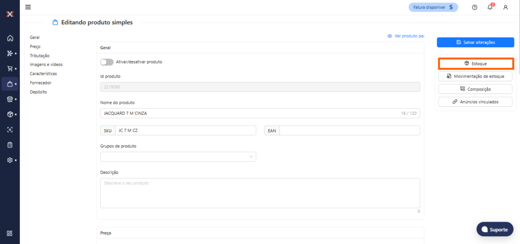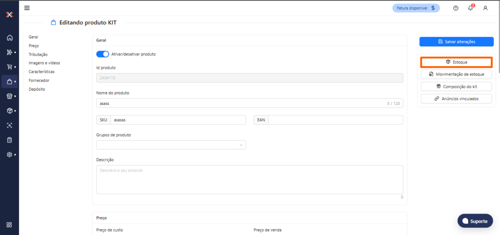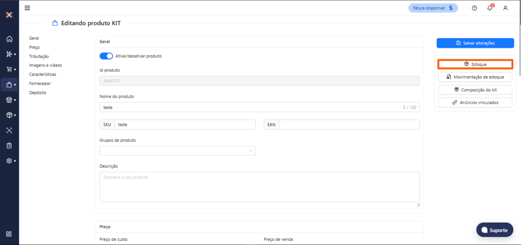 5. Ao acessar o produto kit desejado, a opção de ‘Estoque’ será exibida, Para produtos com o estoque dinâmico desativado essa tela é possível realizar a alteração do estoque. Nessa tela, será possível: