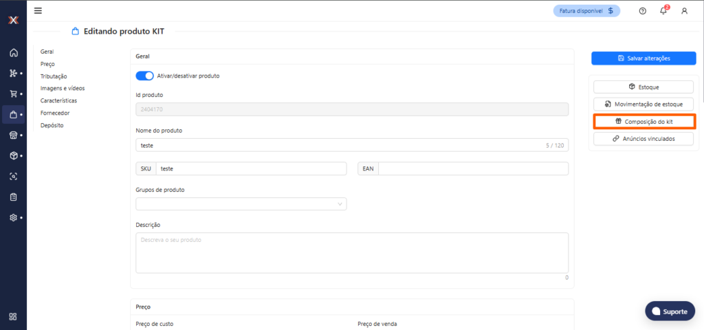 - A edição de estoque do kit ficará bloqueada;