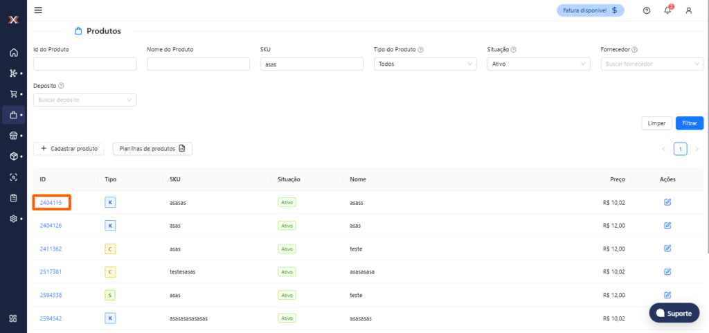 2. Após acessar a tela de ‘Produtos’, selecione o produto que deseja alterar o estoque clicando no “ID” do produto.