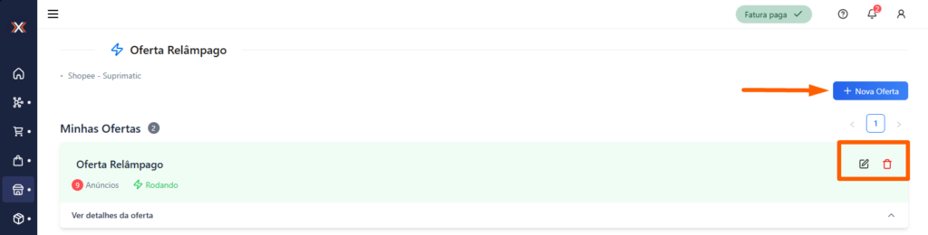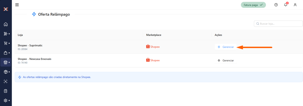 2. Após acessar a tela de Oferta Relâmpago, você verá todas as suas contas vinculadas à plataforma Shopee. Em cada uma delas haverá um botão denominado “Gerenciar”. Ao clicar nesse botão, é possível verificar se existem ofertas já criadas, além de editá-las ou excluí-las. Também está disponível a opção de criar uma “Nova Oferta”.