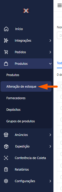 1. Acesse o menu lateral ‘Produtos’ e clique na opção “Alteração de estoque”, para realizar o inventário inicial do estoque dos produtos.