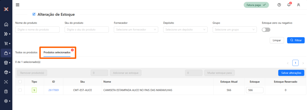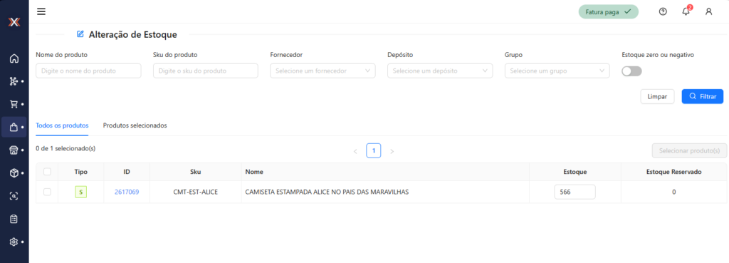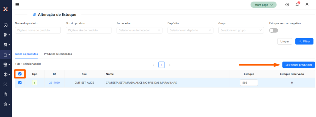 2. Após acessar a tela de ‘Alteração de estoque’, utilize os filtros para localizar os produtos desejados ou selecione-os manualmente conforme aparecem na tela.