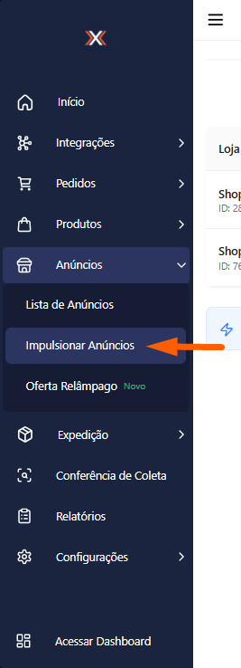 1. No menu lateral esquerdo, selecione ‘Anúncios’ e, em seguida, clique em “Impulsionar Anúncios”.