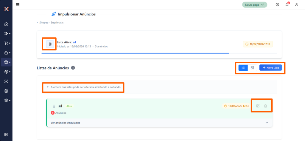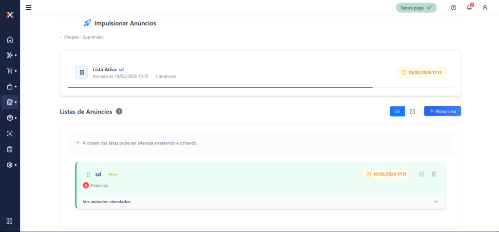 O sistema realiza o impulsionamento na ordem definida por você. Cada lista pode conter até 5 anúncios, que permanecem impulsionados na Shopee por quatro horas. Ao término desse período, o sistema avança automaticamente para a próxima lista. Caso não haja outra lista cadastrada, a mesma será reexecutada, mantendo o ciclo de impulsionamento ativo.