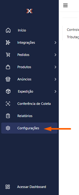 1. Acesse o menu lateral e clique na opção “Configurações”, para ativar o controle de estoque e definir o tipo de controle de estoque.