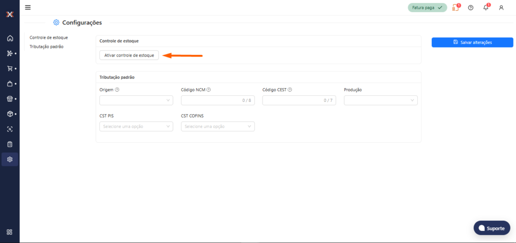 2. Após acessar a tela de ‘Configurações’, clique em “Ativar controle de estoque”.