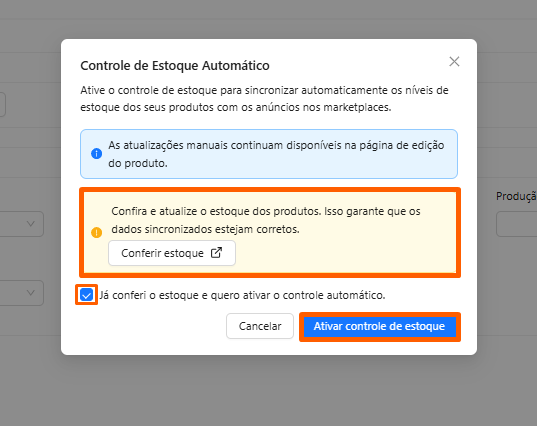 • Realize a ativação do controle de estoque. Antes de ativá-lo, é possível realizar a conferência do estoque; caso prefira fazer isso posteriormente, não há problema fica a critério do Seller.