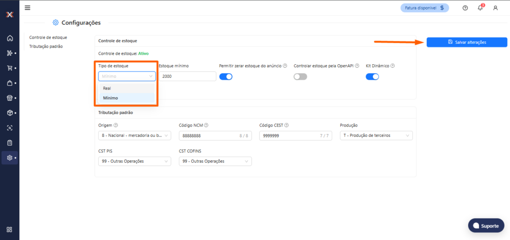 Após selecionar se utilizará o estoque mínimo ou o real clique em “Salvar alterações” para o sistema aplicar as configurações feitas.