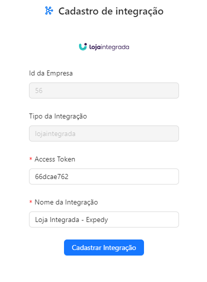 4. Agora, basta preencher as informações na tela da integração da EXPEDY, desta forma.
