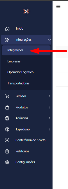 1. Acesse o menu lateral ‘Integrações’ e clique na opção “Integrações”.