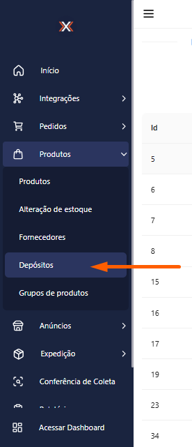 1. Acesse o menu lateral ‘Produtos’ e clique na opção “Depósitos”.