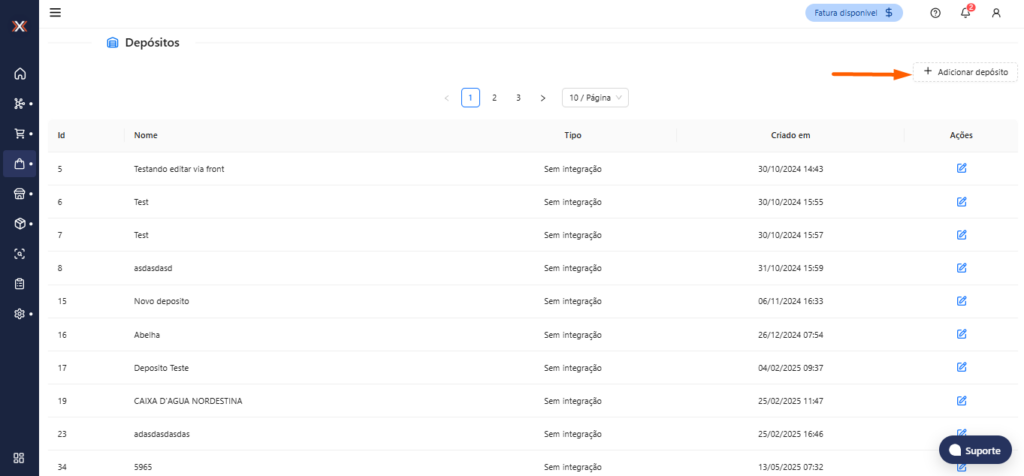2. Após acessar a tela de ‘Depósitos’, o sistema exibirá em forma de lista todos os depósitos criados, para criar um novo depósito, clique em “+ Adicionar depósito“.