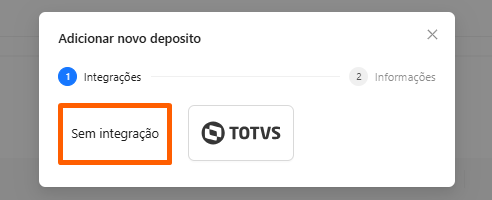 3. Selecione a opção sem integração e de um nome para seu Depósito.
