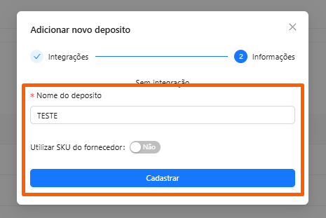 4. Preencha o nome do depósito, escolha se você deseja utilizar ou não o SKU do fornecedor na lista de separação, e clique em cadastrar.