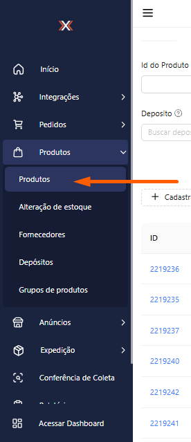 1. Acesse o menu lateral ‘Produtos’ e clique na opção “Produtos”.