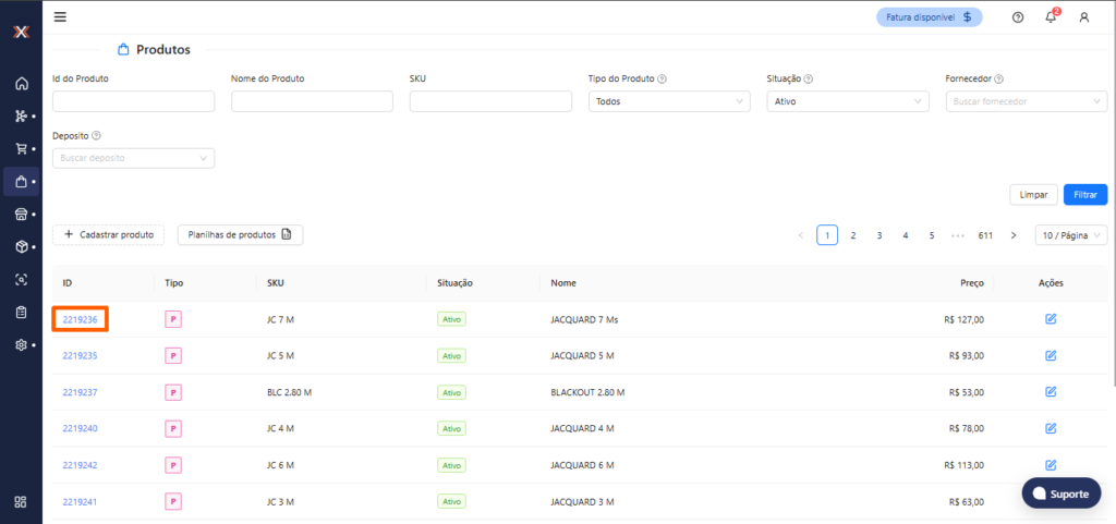 2. Na tela exibida, clique no “ID” do produto desejado para abrir os detalhes.