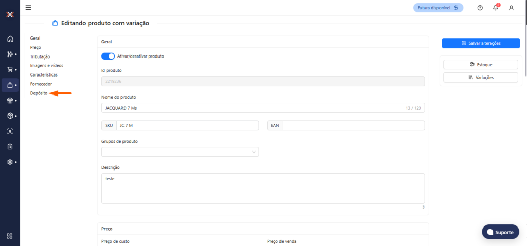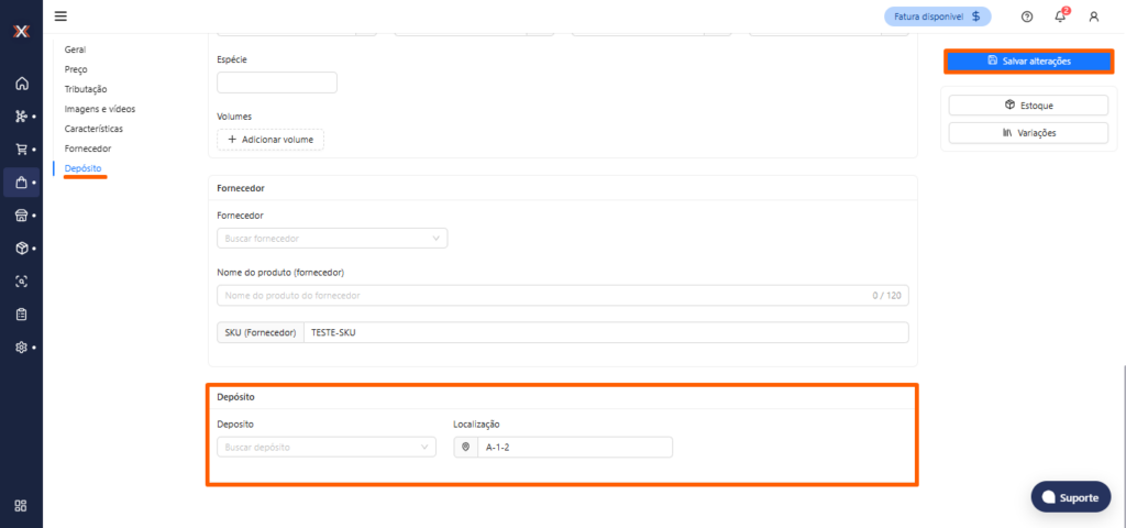 5. No cadastro de produtos, existe um campo específico para selecionar o depósito do produto.